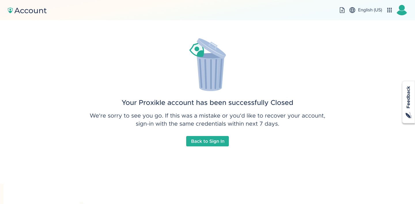 - You will be redirected to a screen which states “Your Proxikle Account has been successfully closed”.